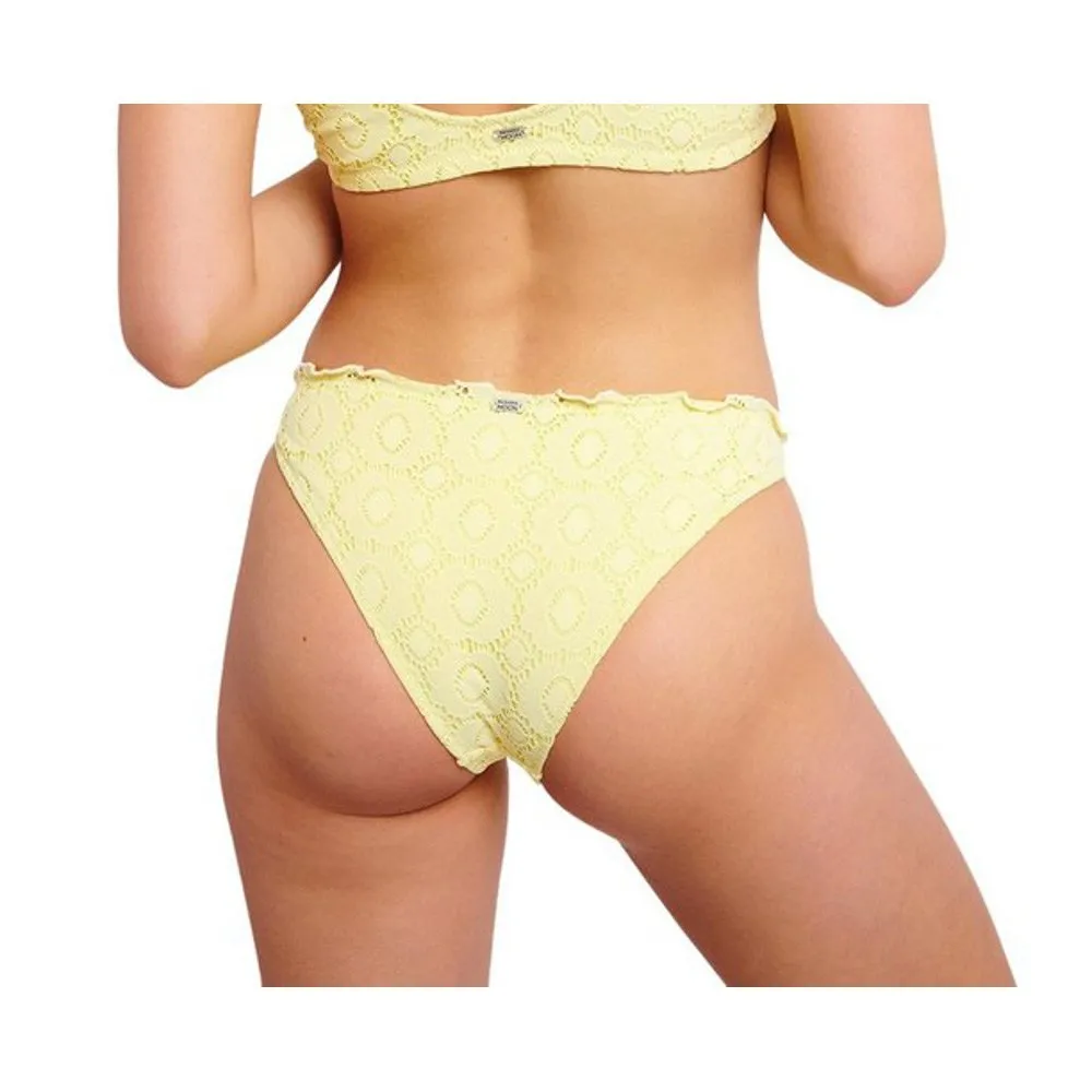 Swimsuit bottoms, straw yellow color, and lace/crochet-like material. This swimsuit bottom is fully lined and has a ruffled top edge. Normal notch.