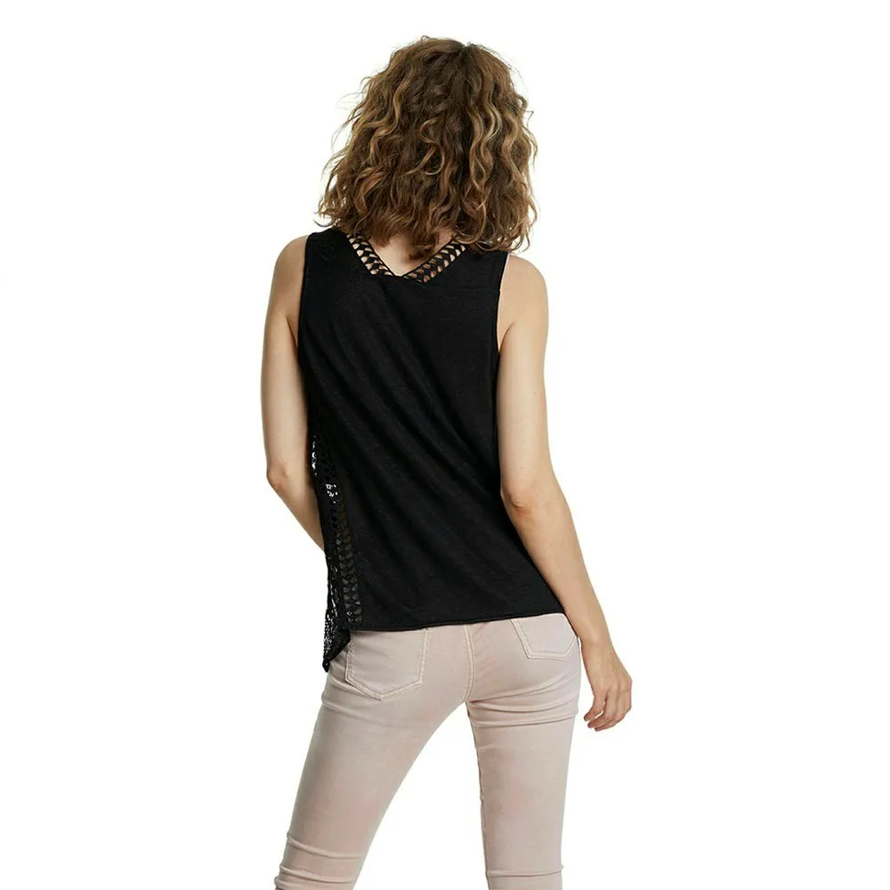 Black linen vest-top featuring a variety of slightly sheer crochet details down the side.