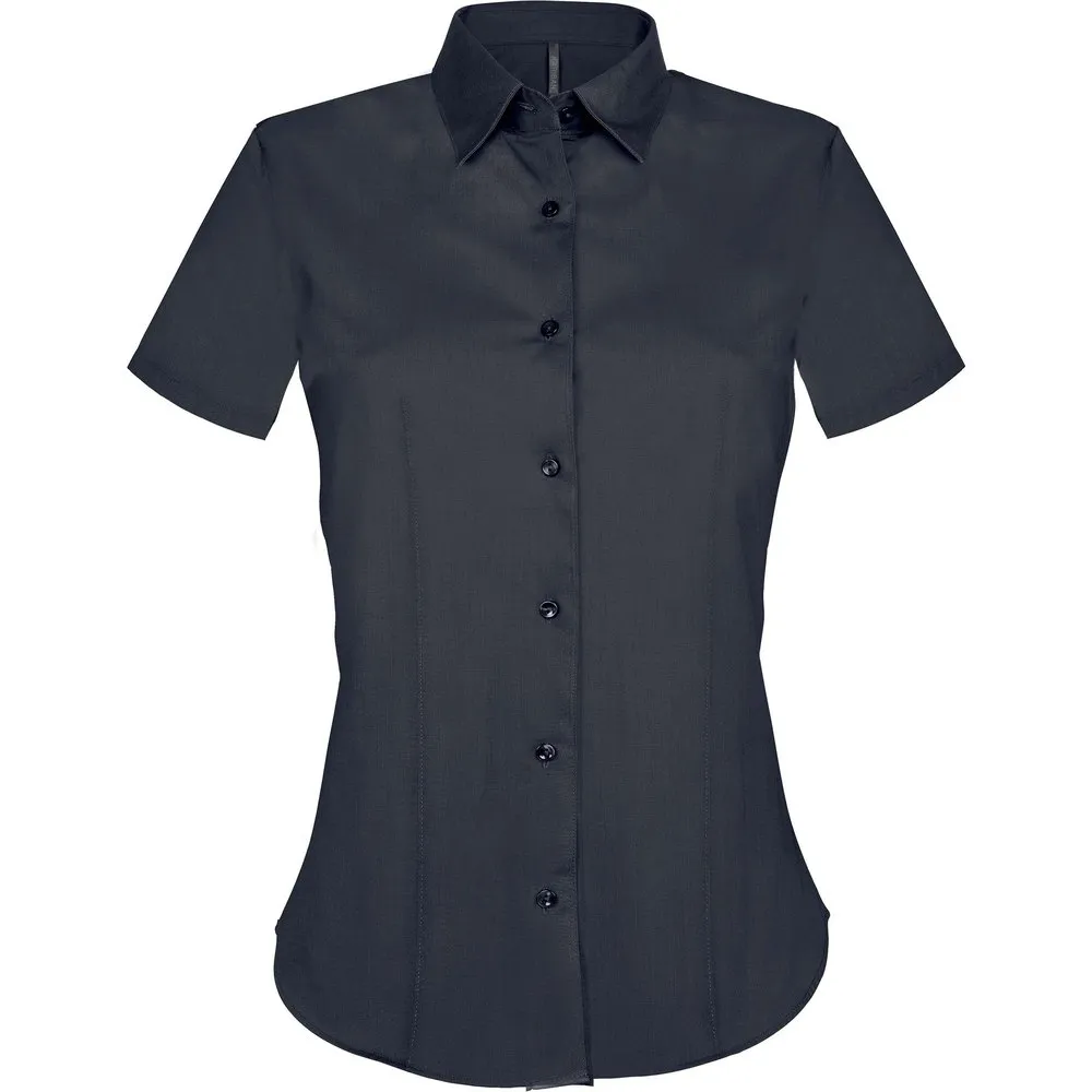 97% cotton / 3% elastane. Ease and ideal fit due to its stretch side. Non-buttoned collar. Tone on tone buttons. Back and front darts at waist. Filled double bottom sleeves hem. 1 button back. Rounded bottom.
