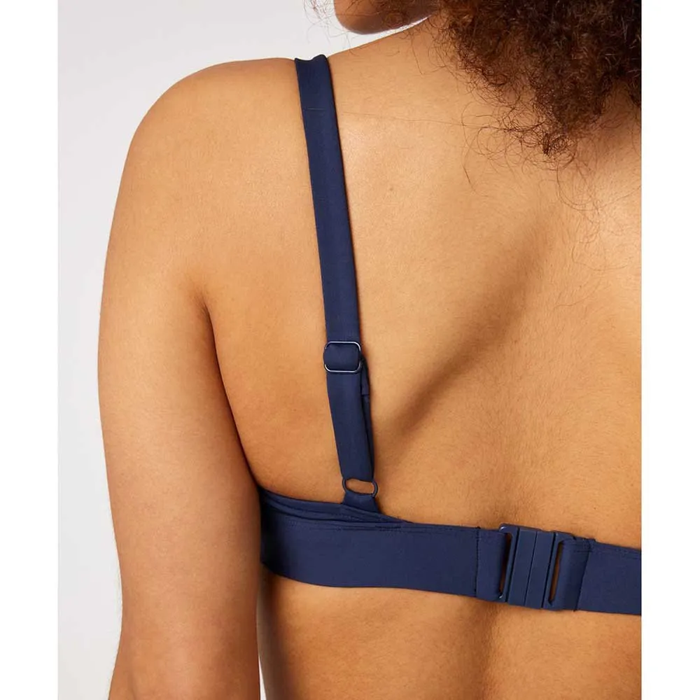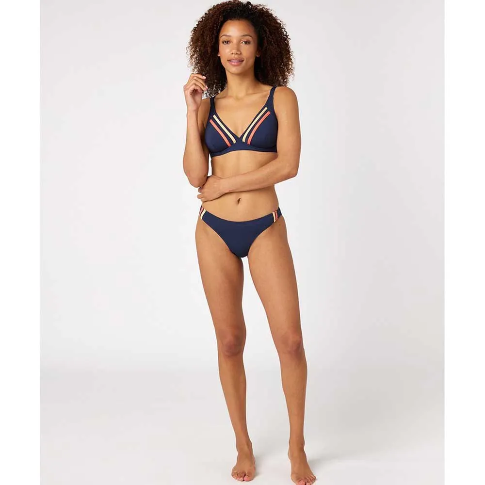 The Rip Curl Day Break CD Tri bikini top takes us back to the 80s! We love this triangle bikini top’s navy blue contrast with coloured stripes on a navy blue background. For a cool, stylish look on the beach this summer.