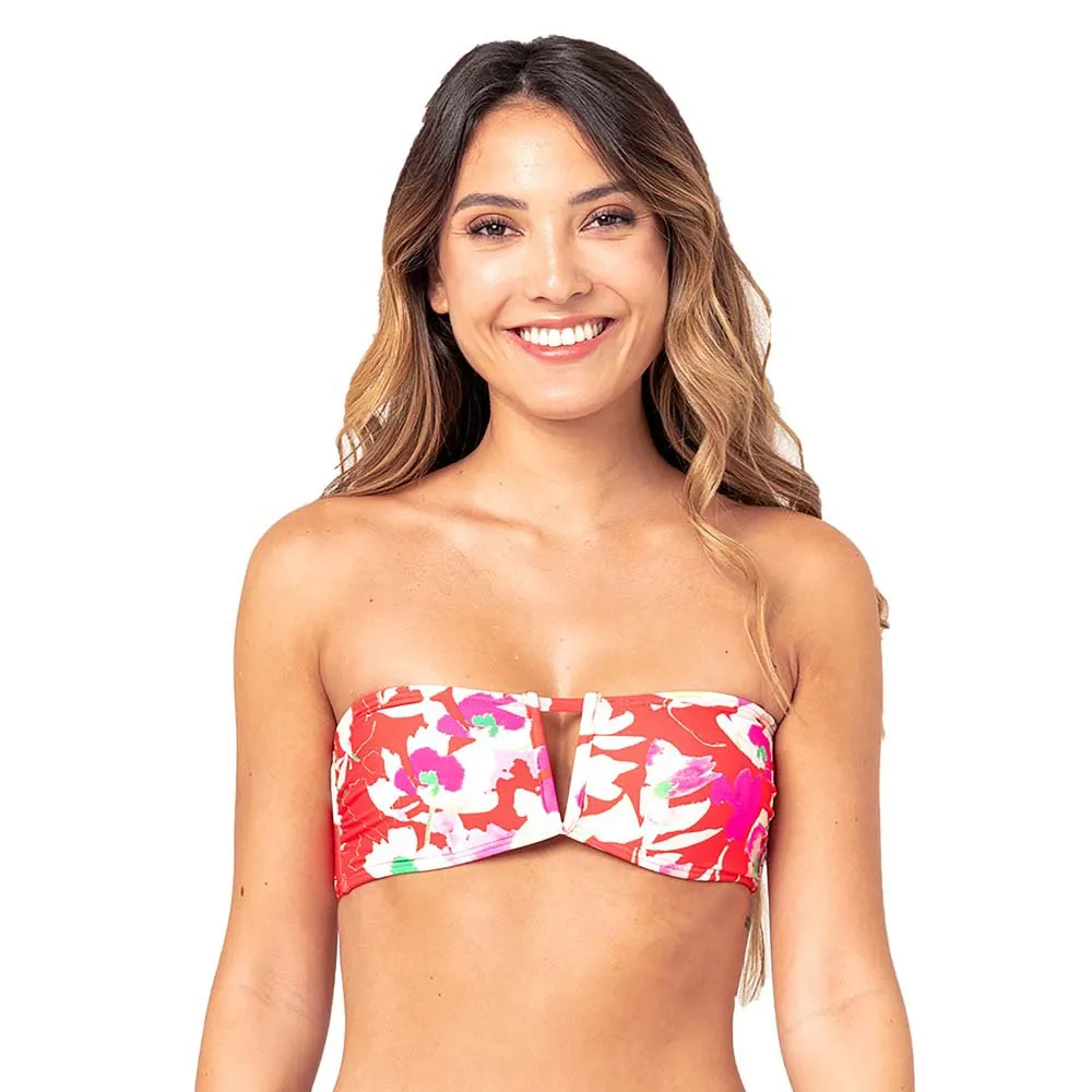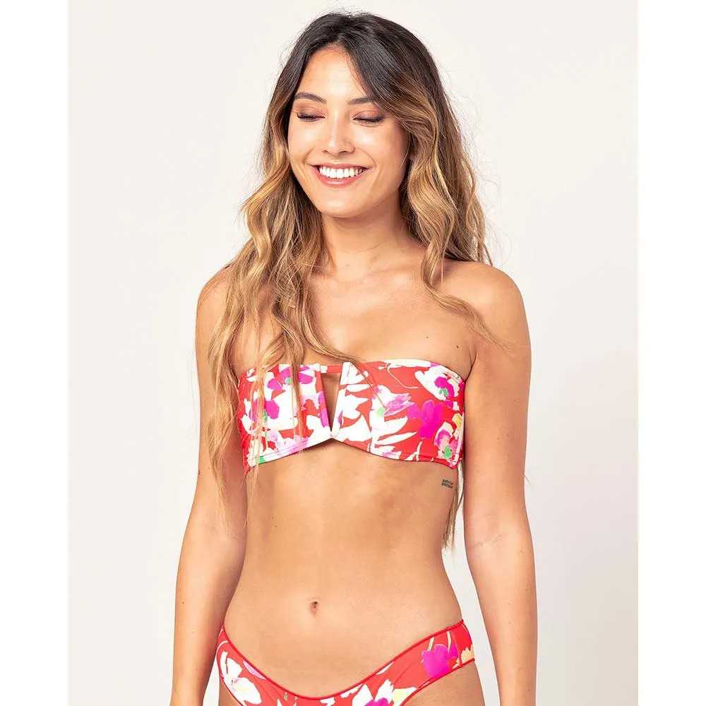 Enjoy your summer with the Sugar Bloom bandeau top from the Rip Curl surf label! This bikini top is made of Xtralife Lycra, an innovative Rip Curl fabric that is highly resistant to salt, chlorine and sunlight. Presented in a vibrant red floral print design, it will enhance your complexion to enjoy the sunniest days through the summer months. Underwiring and removable padding provides perfect support for the bust. Also includes a detachable tie at the neck. The V-shaped design in the middle of the bust adds a trendy and original touch. This Rip Curl bikini top can be paired with a whole host of bikini bottoms from the label’s Sugar Bloom collection. Offering perfect support for sporty feminine figures, the sound of the waves is calling!